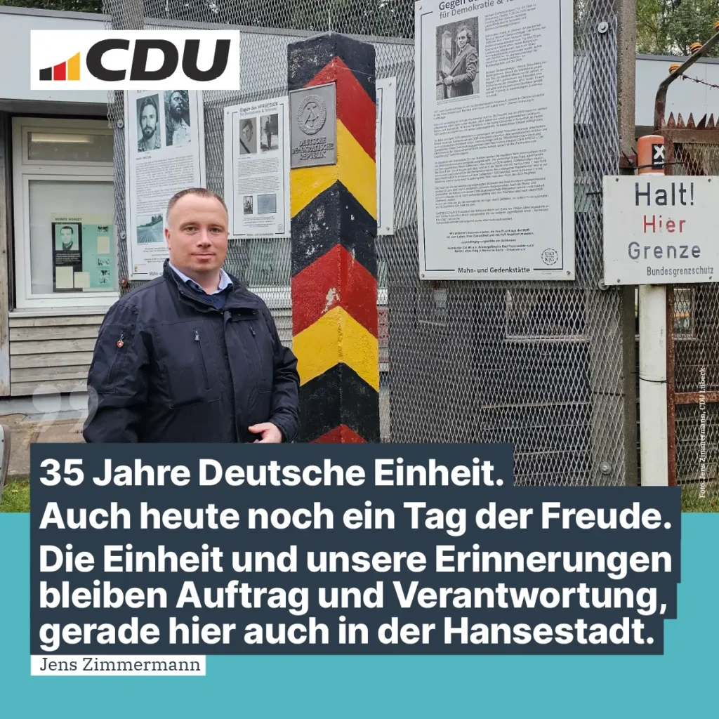 Zum diesjährigen Tag der Deutschen Einheit werden Jens Zimmermann und weitere Vertreterinnen und Vertreter der CDU Lübeck wie in den vergangenen Jahren an der Gedenk- und Begegnungsfeier in Schlutup an der Grenzdokumentationsstelle teilnehmen. Der Austausch mit Zeitzeuginnen und Zeitzeugen, Bürgerinnen und Bürgern sowie Vertreterinnen und Vertretern aus Vereinen, Initiativen und Politik ist ihnen ein besonderes Anliegen. Die Erinnerungen an jene historischen Tage bleiben nicht nur Mahnung und Quelle der Dankbarkeit, sondern auch Inspiration für Gegenwart und Zukunft.