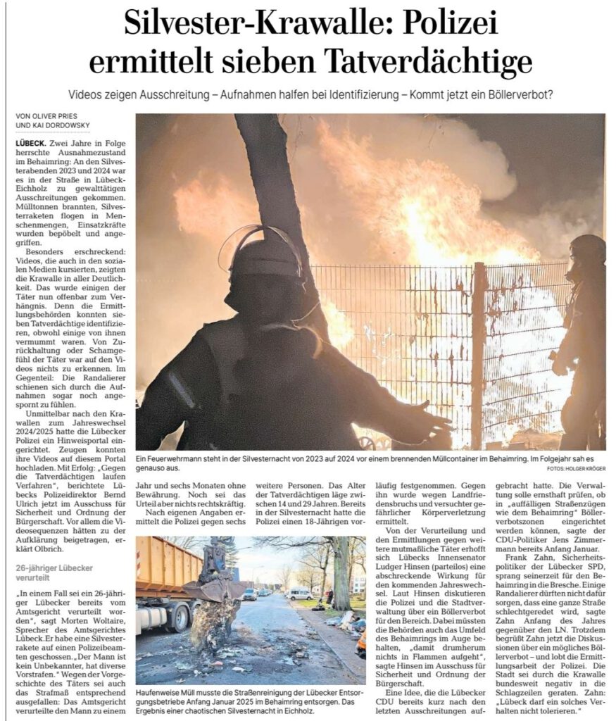 Die Lübecker Nachrichten berichten heute auf Seite 1 ihres Lokalteils über erste Konsequenzen für ermittelte Straftäter aus der Silvesternacht am Behaimring.