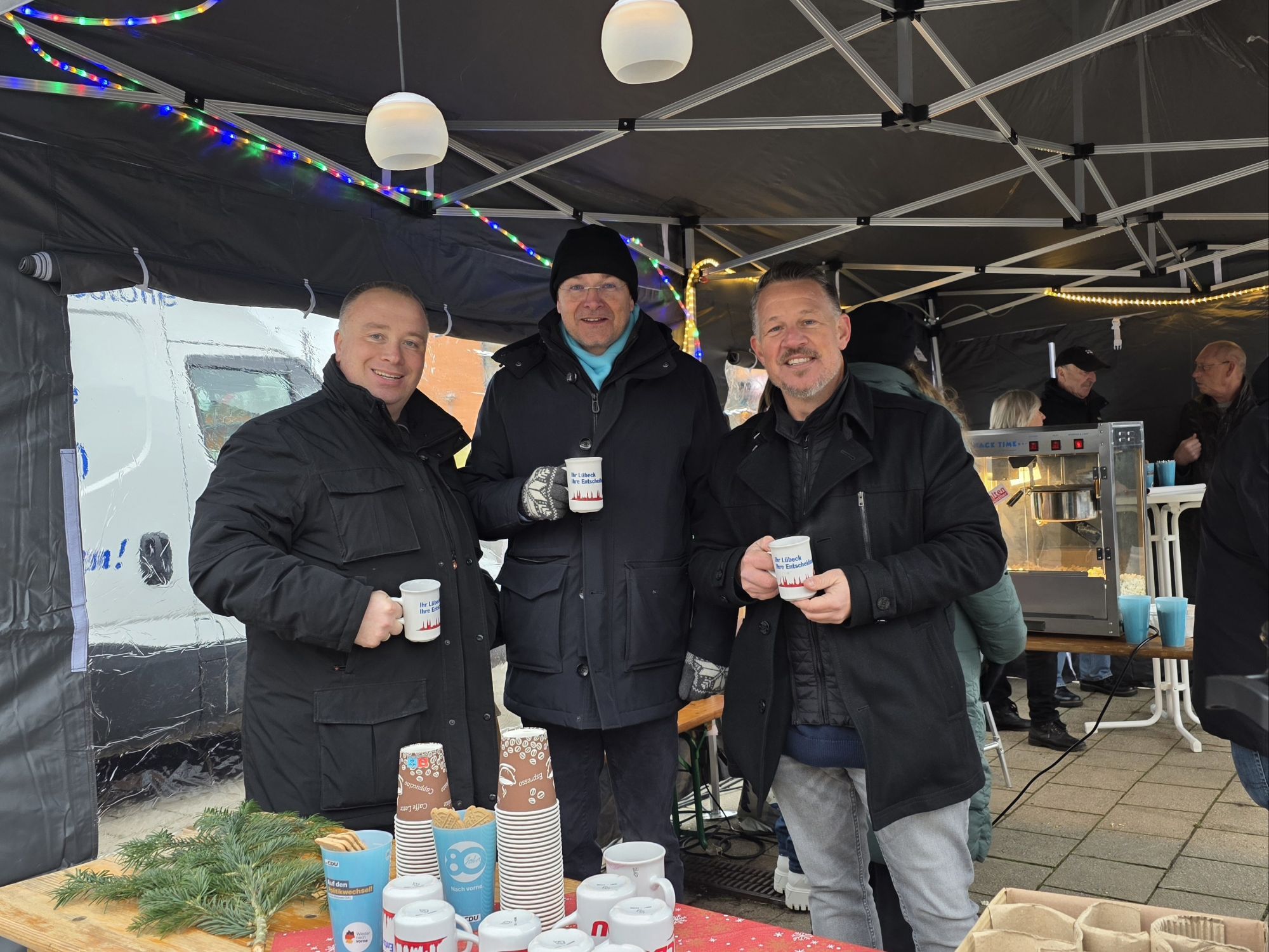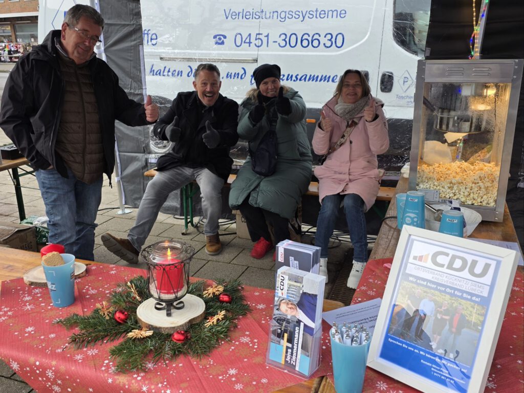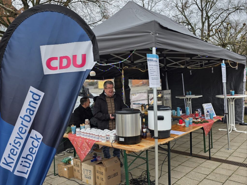 Anlässlich des 80. Geburtstags der CDU hat der Kreisverband Lübeck am vergangenen Samstag mit einem Canvassing-Stand vor dem Lübecker Rathaus den Dialog mit den Bürgerinnen und Bürgern gesucht. Neben informativen Gesprächen stießen vor allem kleine Giveaways auf großes Interesse. Besonders beliebt waren die frisch gebackenen Kuchenstücke direkt vor Ort sowie Tassenkuchen zum Mitnehmen.
