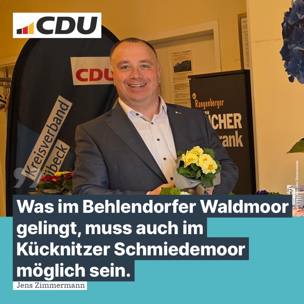 „Was im Behlendorfer Waldmoor funktioniert, darf für das Schmiedemoor in Kücknitz nicht länger als unmöglich dargestellt werden. Die Menschen vor Ort erwarten zu Recht, dass mit dem gleichen Engagement und der gleichen Ernsthaftigkeit auch hier nach Lösungen gesucht wird“, erklärt Jens Zimmermann, CDU- Bürgerschaftsmitglied aus Lübeck-Kücknitz.